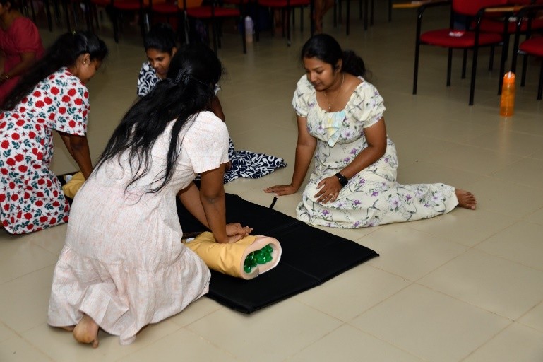 To overcome the lack of costly training equipment, low-budget CPR manikins were innovatively designed by Mrs. Darshika Attanayake and Dr. Lislie Ranaweera using recycled materials, while 10 CPR with AED training manikins were temporarily provided by the council for academic training. This cost-effective initiative ensured continuous practical training, saved significant university funds, and enhanced students’ confidence and competence in life-saving skills, contributing to improved emergency preparedness and community safety.